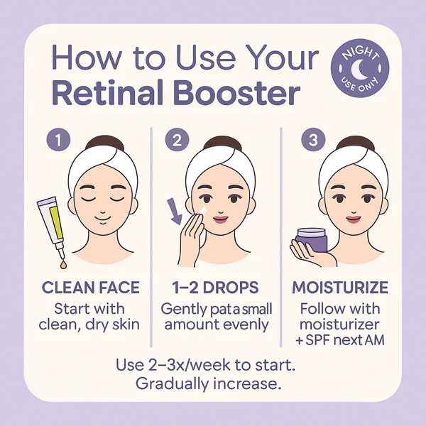 If this is your first time using retinal, start applying it every other night for the first two weeks. Apply a small amount to problem areas (expression lines, pores) to allow the skin to adapt.